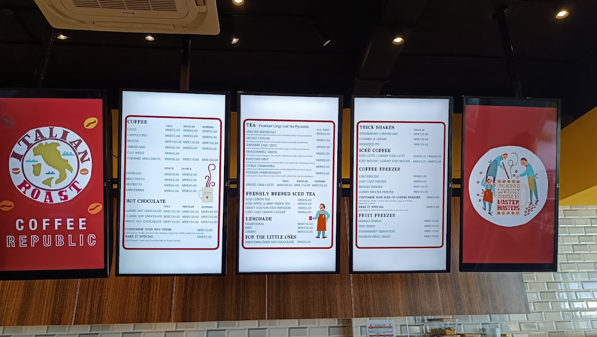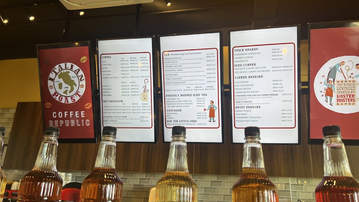 The menu at Coffee Republic Hulhumale primarily features a selection of coffee beverages, with an emphasis on espresso-based drinks. Alongside the coffee offerings, the menu includes light food options such as sandwiches and desserts. Customers can expect a variety of quick-serve items suitable for breakfast, coffee breaks, or light meals throughout the day.